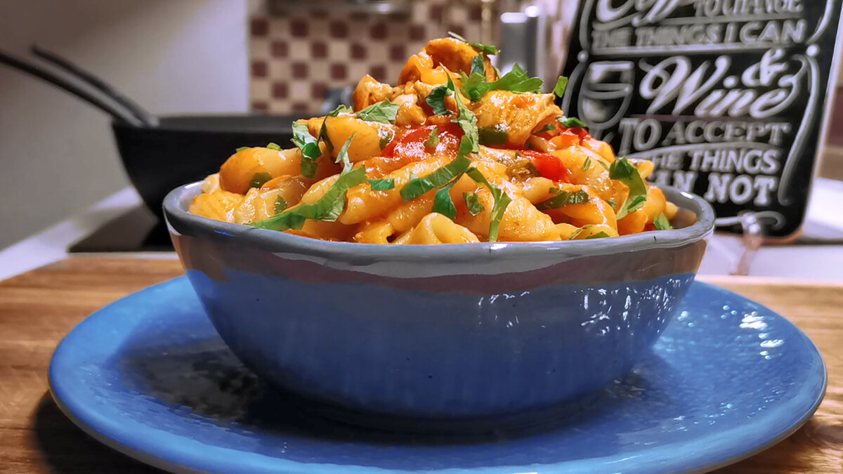 Когда не знаем, что приготовим и продуктов не слишком много, чаще всего на этом рецепте останавливаемся. Берем недорогие макароны и одну куриную грудку, закладываем все в одну сковороду и под крышку. Через 25 минут вкуснейший, сытный и экономный ужин или обед уже на столе, сразу с соусом и все в одной посуде.