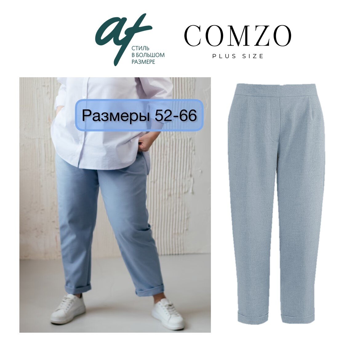 А вот если купить одну пару брюк на лето, чтобы подо всё? Бывает так? Да, и это будут не джинсы. Это будут брюки укороченные, расслабленного по бедрам кроя, комфортной посадки и приятного голубого цвета. И это уже знакомый нам бренд COMZO! Хотите докажу, что это самые базовые штаны на лето? Во-первых, они сочетаются с любой обувью – каблук или плоский ход, женственная или спортивная. Во-вторых, вариантов сочетаний по цвету – сколько угодно! А уж по фасонам верхов – вообще нет ограничений. Вы наденете их и с футболкой, и с рубашкой, и с пуловером, да хоть с платьем! Только не застегивайте его полностью, оставьте снизу расстегнутым до талии или вообще расстегните полностью, добавив топ. И продолжаем спор, хотите? Итак. Вы заказываете эти чудесные брюки в группе ВКонтакте, на странице бренда. Или на вайлдберриз вот здесь. Кстати, базовая футболка и сиреневая рубашка с моих картинок – это тоже COMZO! Далее. Примеряете дома со всеми своими верхами. И если они не будут сочетаться хотя бы с о