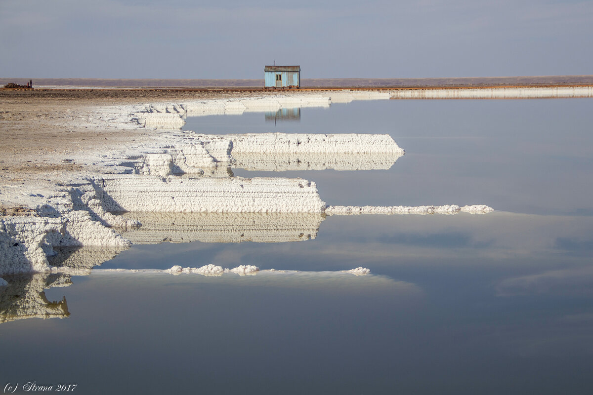 В дальней части гигантские ковши должны постоянно черпать всё новую и новую соль, увозя её по проржавевшей до дыр железной дороге, но и они в тот день замерли и стояли без движений.