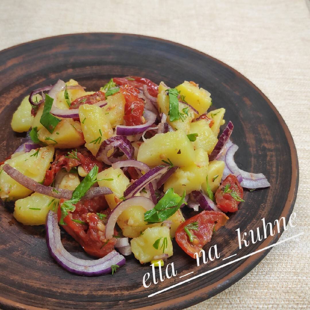 А вы любите придумывать блюда?! Я -да. Сегодня такой салат получился. #академия #пасха Ингредиенты: небольших картофеля, красных луковицы, вяленых помидоров, зелень петрушки и укропа, масло то помидоров Способ приготовления: Отварить картофель в мундире. Почистить картофель и лук. На разогретой сковороде с маслом от помидоров слегка потопить картофель (2-3 минуты). В миску выложить картофель нарезанные половинками кружочки помидоров, лук полукольцами и зелень. Перемешать (по желанию присолить) и выложить в салатник. Приятного аппетита😍! Если вам по душе мои незатейливые рецепты: подписывайтесь и оставляйте свои фотоотзывы📸!