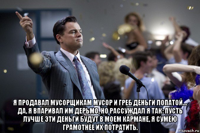 Добрый день, товарищи инвесторы. Поговорим немного о фильмах. А точнее о фильме «Волк с Уолл-Стрит». Это комедия режиссера Мартина Скорсезе, основанная на мемуарах Джордана Белфорта. Главную роль исполнил Леонардо Ди Каприо, который выступил и продюсером картины. Данная роль принесла актёру вторую премию «Золотой глобус». Это пятый совместный проект актёра со Скорсезе.Фильм получил пять номинаций на «Оскар», в том числе «за лучший фильм». Повествование фильма начинается в 1987 году. Джордан Белфорт (Леонардо Ди Каприо) становится брокером в успешном инвестиционном банке. Его босс, Марк Ханна (Мэттью Макконахи), советует ему начинать распутный образ жизни и принимать кокаин. Может ли кино преподать важные финансовые уроки? Несколько выводов можно сделать из диалога Марка Ханна и Джордана Белфорта в ресторане. Вот что говорит Марк Ханн: «Твоя главная обязанность, чтобы дома было что пожрать». «Наша работа – брать бабло из кармана клиента и класть в наш карман» «Никто не знает п