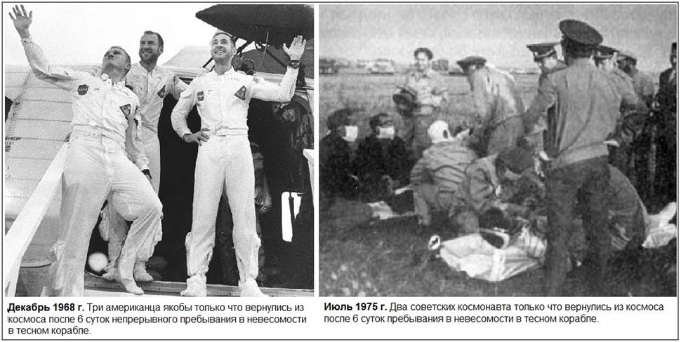 14 суток провели Ловелл и Борман якобы на орбите. Прошло 5 лет и два советских космонавта совершили полёт на 18 суток невесомости. Оба вернулись в предынфарктном состоянии. Хотя летали они в неизмеримо лучших условиях, чем таковые есть в «Джемини». Перечитайте строки о возвращении «Союза – 9» и поглядывайте при этом на весёлые лица этих двух очередных «астронавтов», что так непринуждённо болтают у вертолёта.