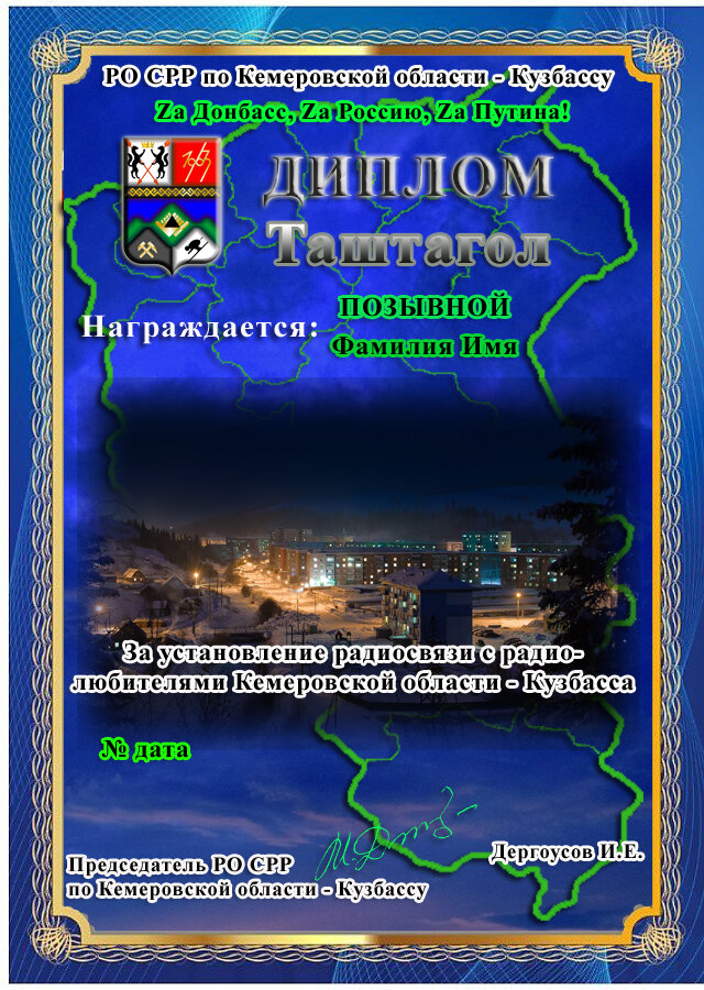 Положение диплома «Таштагол» Диплом «Таштагол» учреждён региональным отделением Союза радиолюбителей России по Кемеровской области – Кузбассу в рамках дипломной программы «Огни вечерних городов Кузбасса». Диплом выдается радиолюбителям Российской федерации, странам ближнего зарубежья, соотечественникам и русскоговорящим радиолюбителям дальнего зарубежья. Для его получения необходимо набрать: В 2022 - 83 очка, в 2023 году - 84 очка и т.д. за радиосвязи, проведенные с радиолюбителями города Таштагол и Кемеровской области - Кузбасса. Таштагол – горняцкий поселок и главным предприятием его является Таштагольский рудник по добыче железной руды. Строительство его началось в 1939 году. Через два года, 3 июня 1941 г., на КМК города Сталинск (в настоящее время Новокузнецк) был отправлен первый эшелон железной руды. Начисление очков производится следующим образом: - связи с радиолюбителями Кемеровской области -Кузбасса дают по 1 очку; - связи с радиолюбителями - членами СРР из Кемеровской област