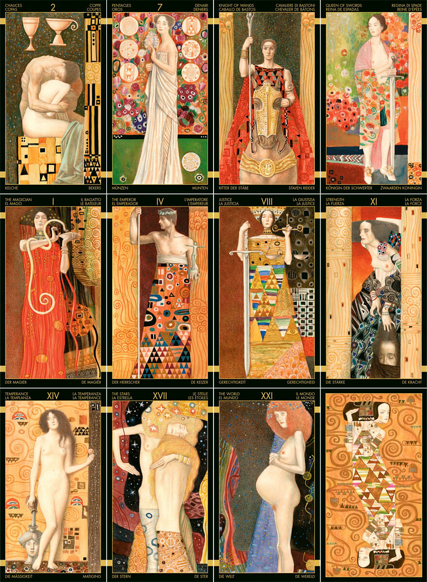 Всем привет,друзья.А вы знали, что существует множество колод ,созданных по мотивам работ известных художников? Вот некоторые из них(список далеко не полный,это только те колоды,с которыми знакома лично я!): Таро Климта было создано на основе творчества австрийского художника Густава Климта. "Золотое Таро Климта — Golden Tarot of Klimt принадлежит авторству Атанаса Атанассова — художнику, который создал целую серию колод, в которых Арканы оформлены фрагментами картин известных художников. В этой же серии выходило Золотое Таро Боттичелли, серебряное пасьянсное Таро Мантеньи, Золотое Флорентийское Таро, колода Золото Икон, Таро Босха. На этот раз художник выбрал основной темой своего творения художественные работы Густава Климта — мастера живописи и основоположника стиля модерн на территории Австрии. Сама колода, впервые вышедшая в 2005 году, выглядит просто роскошно. Золотое тиснение, удивительно красивые, богатые деталями иллюстрации, на большинстве которых мы видим женские фигуры (им