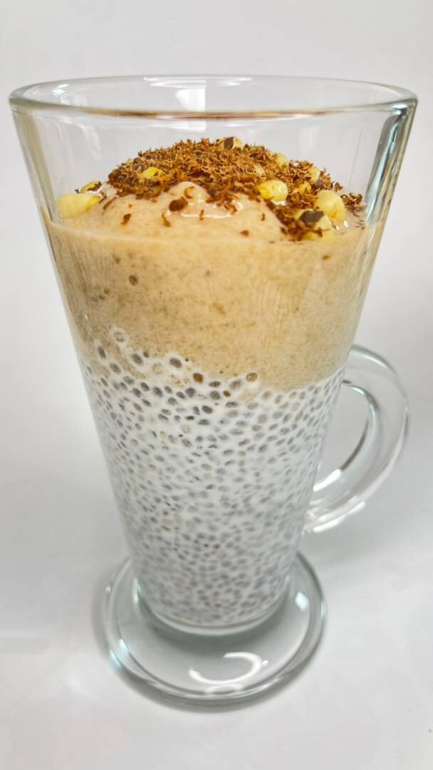 В чашку с чиа-пудингом сверху выкладываем банановое пюре, посыпаем орешками, тертым шоколадом или кокосовой стружкой.