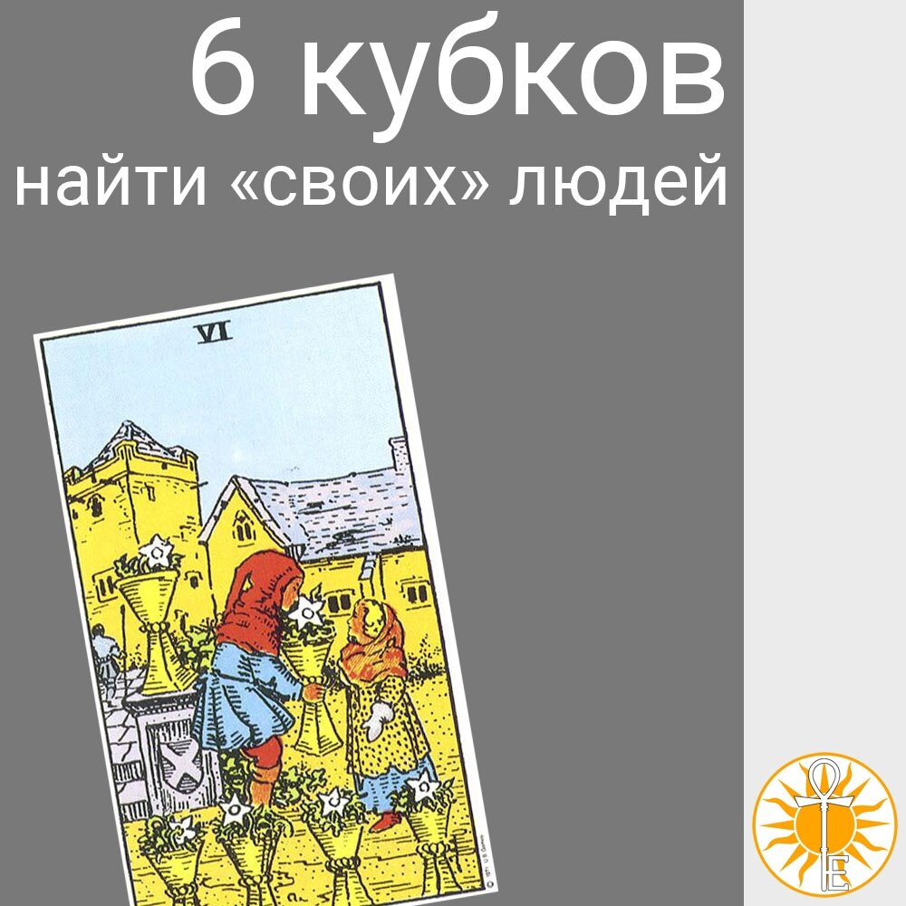 6 кубков – это «мой» человек, хороший друг. Тот, с кем «душа в душу» и с кем «душа отдыхает». Тот, кто принимает тебя таким, как ты есть и всегда готов быть рядом. Искренние, тёплые и доверительные отношения. Друзей по 6 кубков не бывает много, но каждый из них на вес золота.