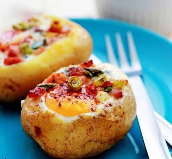 7. Посолите, поперчите, добавьте хлопья красного перца. Уложите слой бекона, зеленого лука и немного тертого сыра так, чтобы заполнить половинку картофеля на ½ часть. Вбейте в каждую половинку по яйцу.