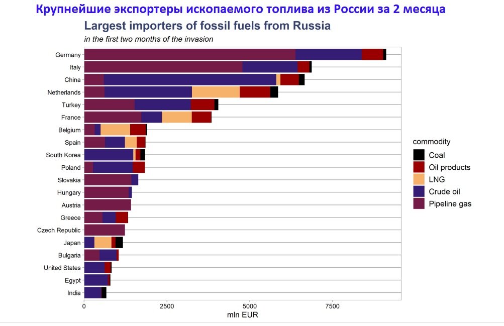 Согласно исследованию Центра исследований энергии и чистого воздуха (CREA) за два месяца с начала специальной военной операции Россия экспортировала ископаемого топлива на сумму 63 миллиарда евро. ЕС импортировал 71% этого объема на сумму около 44 млрд евро. Крупнейшими импортерами по порядку были Германия (9,1 млрд евро), Италия (6,9 млрд евро), Китай (6,7 млрд евро), Нидерланды (5,6 млрд евро), Турция (4,1 млрд евро) и Франция (3,8 млрд евро). Поставки нефти в ЕС упали на 20% и угля на 40%, а поставки СПГ выросли на 20%. Закупки газа ЕС через трубопроводы увеличились на 10%. Поставки нефти в пункты назначения, не входящие в ЕС, увеличились на 20%, при этом пункты назначения существенно изменились. Поставки угля и СПГ за пределы ЕС увеличились на 30% и 80% соответственно. Санкции не работают. Падение экспорта нефти на 20% в ЕС компенсировалось ростом ровно такую же величину в пункты назначения, «не входящие в ЕС». Экономика не рухнула, фондовый рынок ждет довольно скорое восстановле