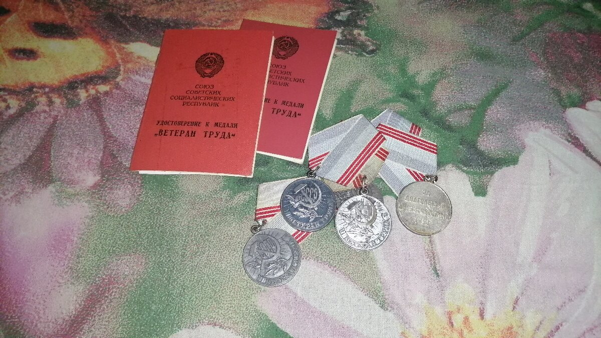Привет, всем! Разбирая во всех старых коробках нашла медали моих бабушки и дедушки. Правда, сейчас я не могу точно сказать кого и чьи именно эти награды. Они абсолютно одинаковые. А вот бабушка с дедушкой их как-то различали. На одной стороне надпись -ветеран труда СССР. А на другой стороне надпись- за долголетний добросовестный труд. И удостоверение к медали 🏅 "ветеран труда". Где-то еще у нас лежат такие удостоверения, ведь на каждую медаль полагается удостоверение. А я нашла только два удостоверения. Возможно, я еще их найду. А возможно уже и нет. Моя бабушка была старше нашего дедушки на один год. Бабушка получила удовольствие раньше на один год, чем дедушка судя по этим удостоверениям. Бабушку наградили в мае 1985 года. А дедушку в сентябре 1986 года. А вот остальные медали, к сожалению, не известно когда были выданы. Раньше или позже годами, чем эти. Но факт остаётся фактом, что в то время рабочих людей награждали, выдавали медали. Это было таким почетом и славой.Сейчас в наше в