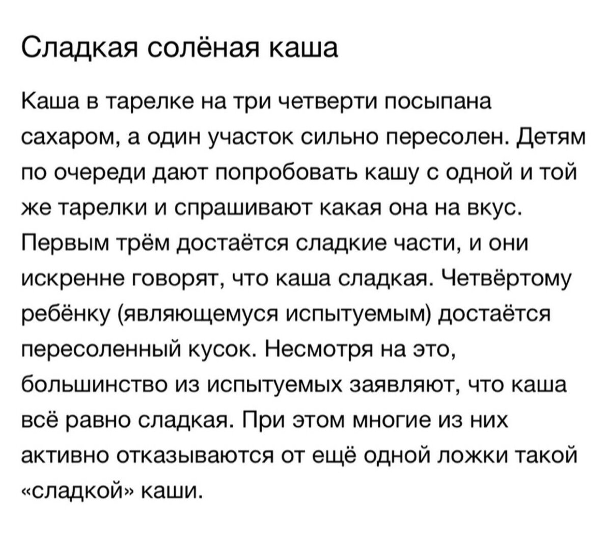 Быть как все - естественное стремление ребенка. Он часто поддается внушению и выдает чужое мнение за свое. Но для взрослого - это потеря личности, приспособленчество, конформизм, формирующий психологию раба😔. Так как же это понять? Выяснить можно с помощью очень интересного эксперимента. Оригинальный ход эксперимента было показано в фильме «Я и другие», ещё в СССР. Я взяла 2 стакана с водой. В один добавила соль, в другой сахар. Мне показалось это проще, чем варить кашу. Сажаем ребёнка напротив себя, ставим два стакана. Пробуем из одного (с сахаром) и говорим «Ой, соленая какая! Попробуй!». Потом повторяем то же самое с другим стаканом, но он уже будет «сладкий». Если ребенок повторит за вами - и скажет, что сладкая вода соленая, а соленая сладкая, значит нужно уделять больше внимания развитию его собственного мнения. Если он не провелся на провокацию - значит у него все хорошо с отстаиванием своей позиции.