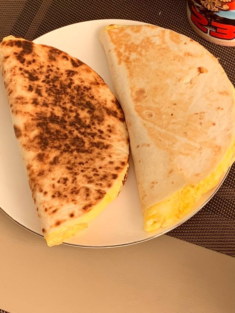Ингредиенты: Пшеничные (томатные, сырные) лепешки продаются в магазине, Яйца, Молоко, Специи, соль , Начинка любимая Способ приготовления: Яйца и молоко, соль, специи смешиваем и выливаем на сковороду диаметр как лепешка, сверху укладываем лепёшку слегка придавив, даем приготовиться омлету. Как только омлет готов, переворачиваем лепёшкой вниз и выкладываем на одну половину начинку, у меня ветчина, помидор сыр, можно лист салата, грибы обжаренные и тд, накрываем второй половиной лепешку и поджариваем с двух сторон. Можно начинку выложить посередине и сложить лепешку по бокам и обжарить.