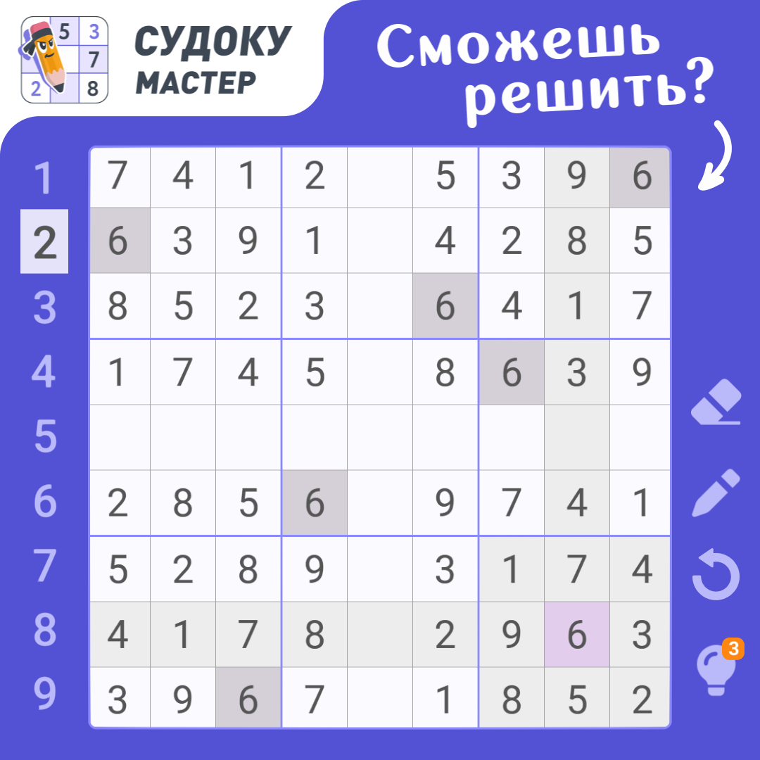 Мы решили уже столько загадок, что эта явна не покажется трудной! Однако, не стоит пренебрегать вниманием, ведь в любой момент можно проглядеть важный элемент! Так что вперед, решите эту и другие задачи Судоку!