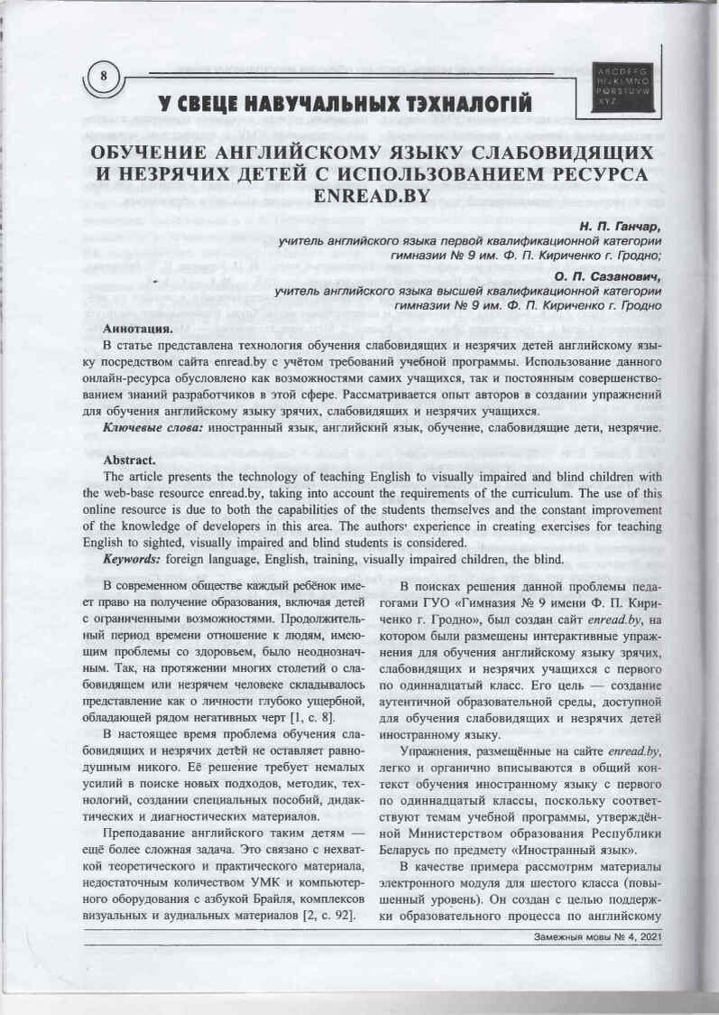 Ганчар Н.П., Сазанович О.П. Обучение английскому языку слабовидящих и незрячих детей с использованием ресурса enread.by