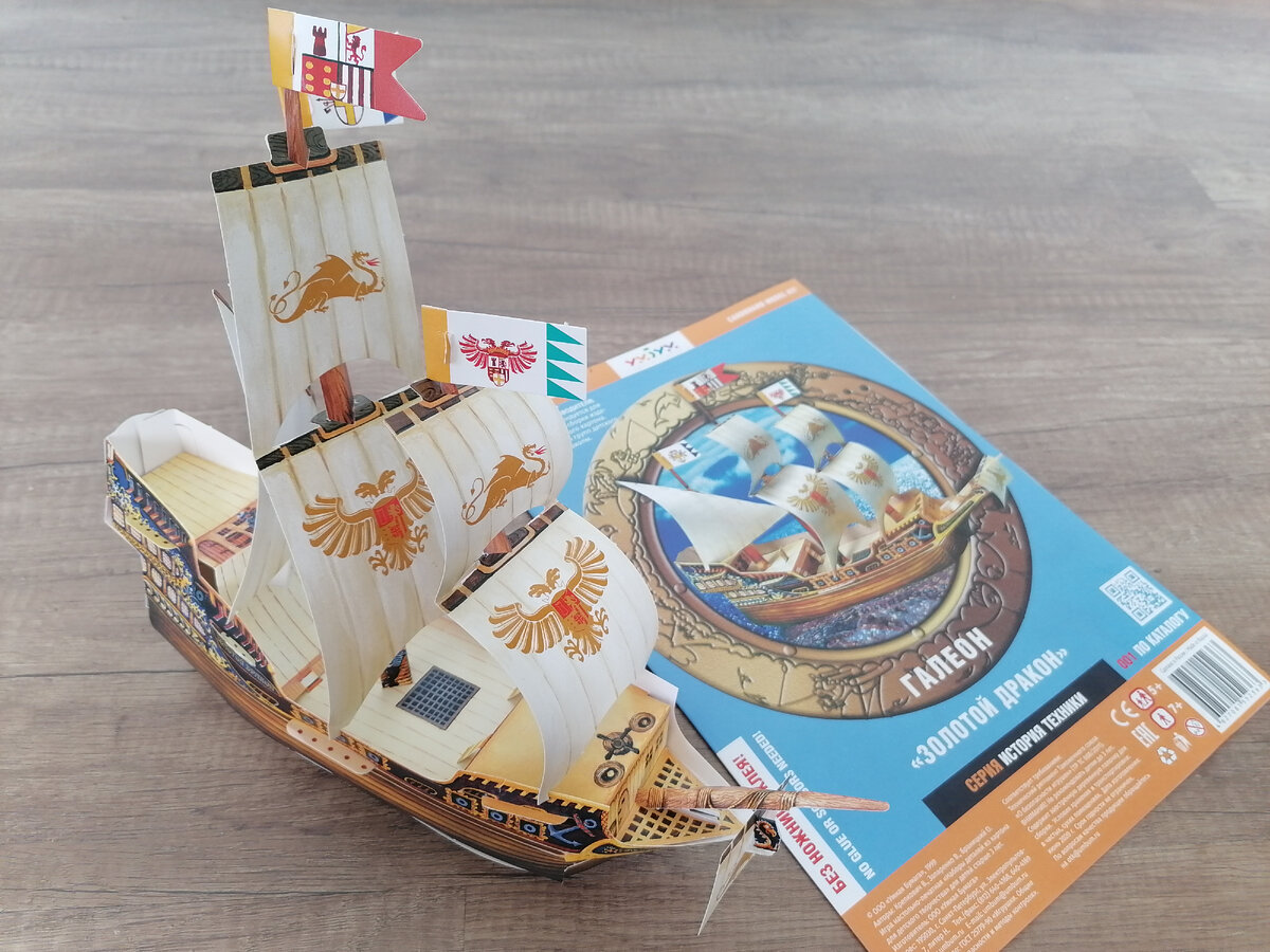 Нужно было что-то быстро выбрать в подарок сыну, чтобы привезти из Казани. Зашла в Леонардо и купила сборную модель корабля за 140 руб. Галеон "Золотой дракон" от компании Умная бумага. Сыну 9 лет сам собирать не смог. Нужно ещё приноровиться к бумаге и тонким прорезям. Собирала я, дети искали и подавали детали. Надо сказать, что и я тоже не сразу собрала. Да и не держалась у меня всё так эпично, как на картинке. Инструкция подробная, понятная. Есть даже словарь морских терминов. Интересное занятие, но скорее для людей с крепкими нервами. На ozon вообще нашла по 97 рублей. Знаю, что модель не предназначена для плавания. Но только не у моих детей. Потонул на волнах корабль быстро. Наверное, был пиратским) #сборная модель бумажныйкораблик