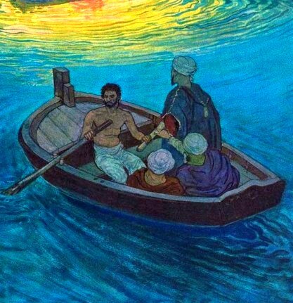(Корейская сказка) Жил себе старый перевозчик. Никому не отказывал он в перевозе. Давали ему что-нибудь за это — он брал; не давали — ничего не просил. Видит раз перевозчик, что через реку плывет курей (толстый змей). Плыл, плыл и стал он тонуть. Тогда старик поспешил к нему на помощь на своем перевозе и перевез его на другую сторону. Ничего не сказал курей, только заплакал, и где упали его слезы, там растут с, тех пор прекрасные цветы. Они растут и в других местах на земле, но только там, где поливают их слезами. В другой раз, когда старик сидел у своего перевоза, увидел он, что плывет молодая косуля и тонет. Поехал старик и перевез косулю на другой берег. Вышла косуля, ничего не сказала и убежала в лес. Пошел старик в лес нарвать себе салату на зиму — вдруг выбежал красивый козел и стал рыть ногой землю. Но в это время проходил какой-то прохожий с лопатой, и козел убежал. — Будь добр, прохожий, покопай в этом месте! Только три раза копнул прохожий, и стукнула лопата обо что-то. То бы