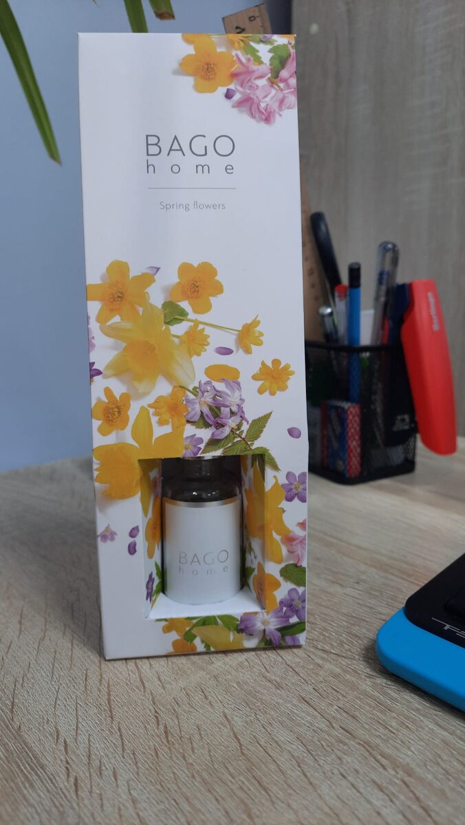 Аромадиффузор - это декоративная емкость, наполненная ароматической жидкостью, в которую вставляются палочки. Такие ароматизаторы прекрасно подходят для создания уюта в доме, лично для меня это отличный способ поднять настроение и расслабиться, также с помощью аромадиффузора можно создать романтическую атмосферу, сконцентрироваться на работе или же избавиться от неприятных запахов. Сегодня я расскажу, как правильно пользоваться ароматическим диффузором, а также познакомлю вас с одним из моих самых любимых ароматов Bago home «Весенние цветы». Знакомьтесь, ароматический мини-диффузор Bago home «Весенние цветы». Продается диффузор вот в такой коробочке. Оформление приятное и по-настоящему весенние, лично меня, как любительницу цветочных ароматов, такой дизайн привлек сразу же. На обороте находится подробная информация о составе, способе использования и особенностях данного диффузора. Пирамида аромата обозначена сбоку: верхние ноты- нарцисс, средние ноты – нероли, нижние ноты - мускус. Из