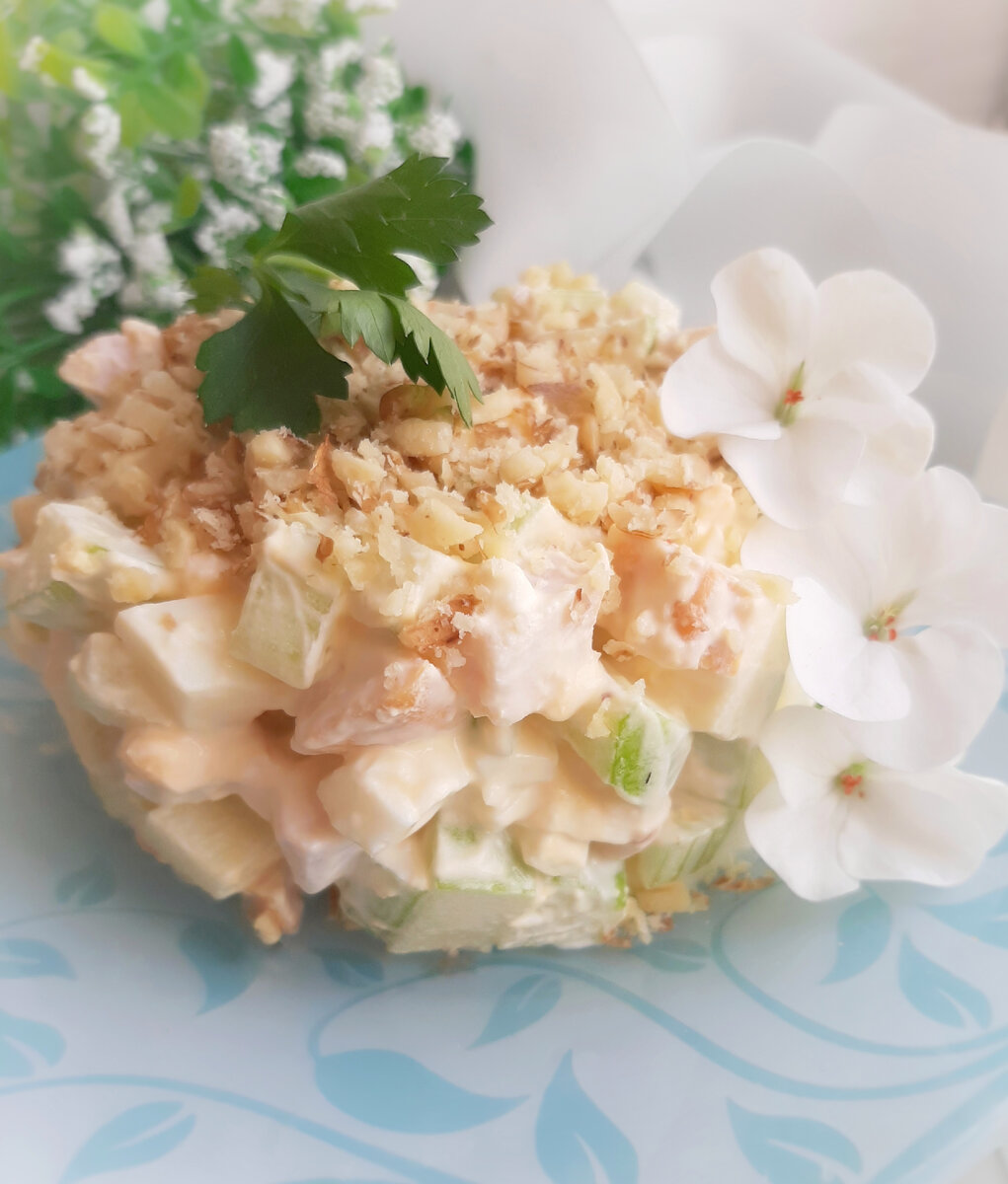 Салатик порадует вкусным и необычным сочетанием. Ещё один интересный рецепт в копилку здорового питания 😊 🍀КБЖУ на 100 г.: 125 ккал 7.7/8.8/3.4 Выход: 475 г. и 594 ккал. 🍀Ингредиенты: Копчёная куриная грудка - 100 г., можно заменить на отварную или запечённую. Яблоко зелёное кисло-сладкое - 100 г., у меня сорт "Гренни Смит". Яйцо куриное - 2 шт. Сельдерей - 50 г. Сметана 15% - 90 г., можно заменить на натуральный йогурт. Грецкие орехи - 15 г. Соль. 🍀Приготовление: 🍎 Яйца отвариваем, остужаем, чистим и нарезаем кубиками. 🍏 Также нарезаем сельдерей, куриную грудку и яблочко. 🍎 Перемешиваем всё в миске, заправляем сметаной, солим по вкусу. 🍏 Грецкие орехи измельчаем и посыпаем сверху. Приятного аппетита 😋 #пп #пп рецепты #ппрецепты #диетические рецепты #пп питание #пп еда #зож рецепты #здоровое питание #рецепты для похудения #худеем вкусно