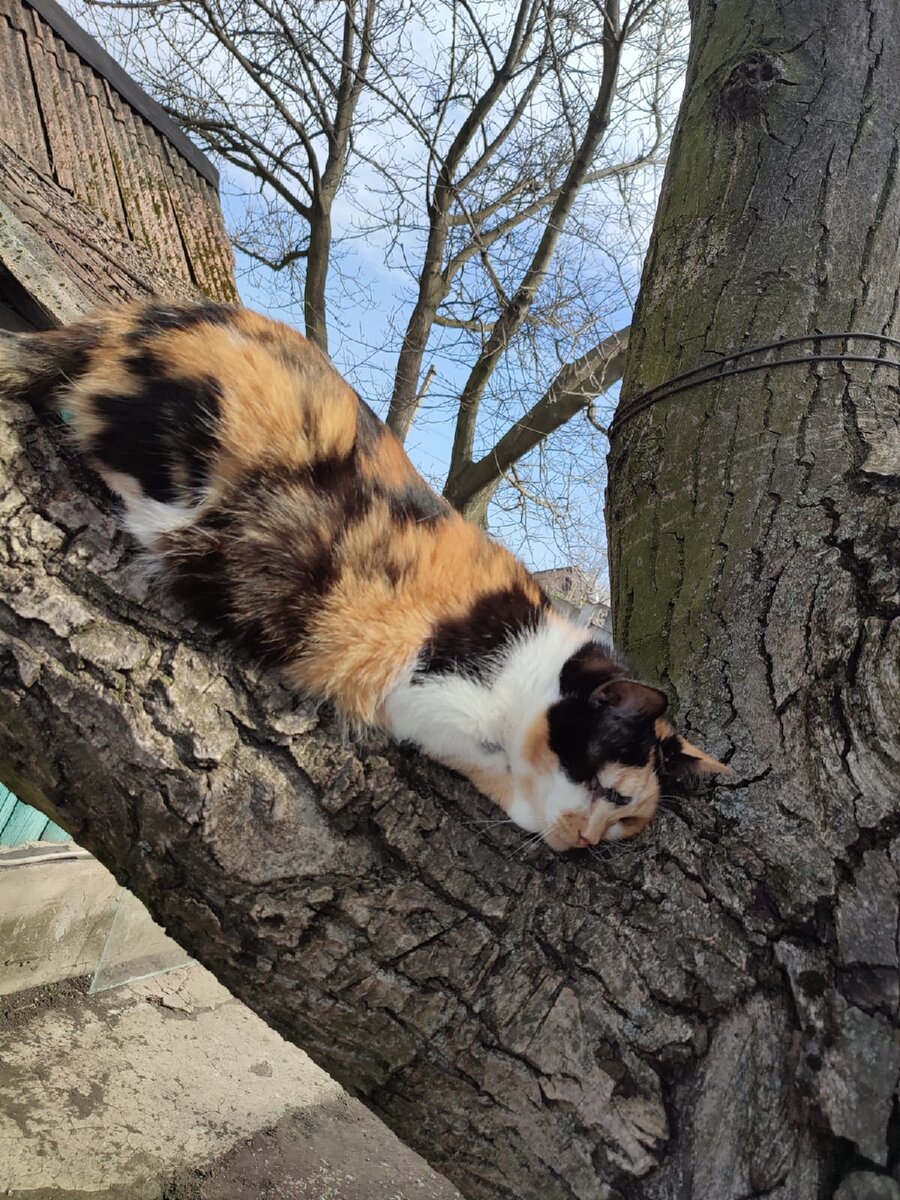 Прогулка с Бубой❤ Просто трехцветное счастье волонтера Влады, ее ангел, ее любимый которебенок😌 из домашнего мини-приюта "Девять жизней". Буба на дереве как посидела, всё кричит и сидит под дверьми, хозяйка не может с неё)