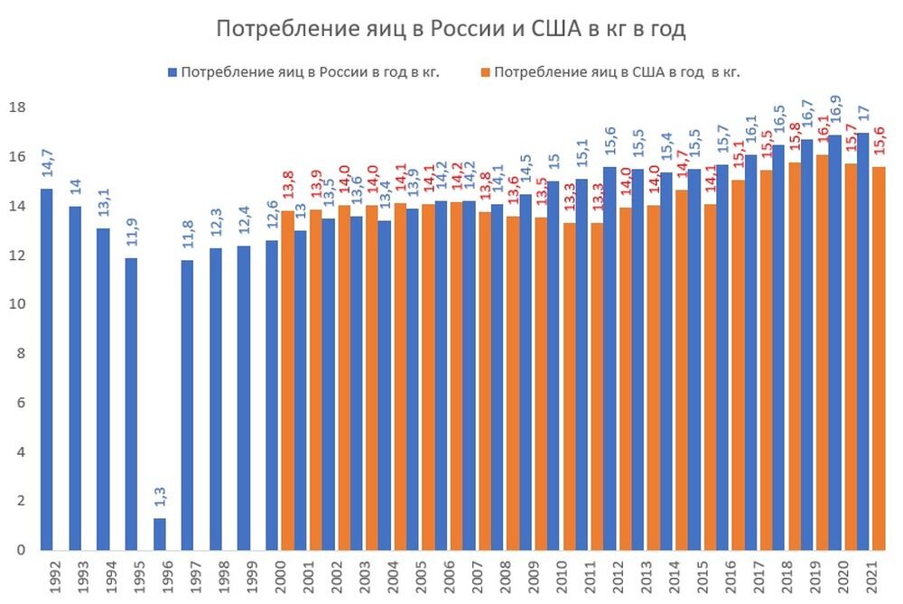 1. Россия входит в топ-10 стран мира по потреблению куриных яиц на душу населения. Мы уже около 15 лет обгоняем по этому показателю США и перегоняем показатели времён РСФСР. В прошлом году мы поставили очередной рекорд – россияне в среднем поглощают по 17 килограмм яиц в год (308 штук, то есть почти по одному яйцу каждый день):