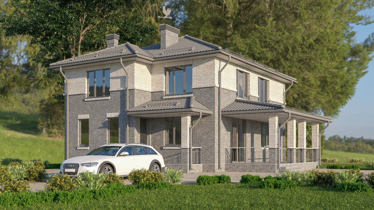Креативная архитектурная визуализация 2-х этажного проекта дома 200 м2 из серого кирпича с террасой