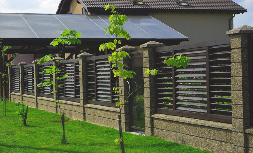 Такое ограждение хорошо пропускает воздух и свет. Возможность монтировать штакетник вертикально, горизонтально, в форме сетки позволяет создавать уникальный внешний вид ограждения.