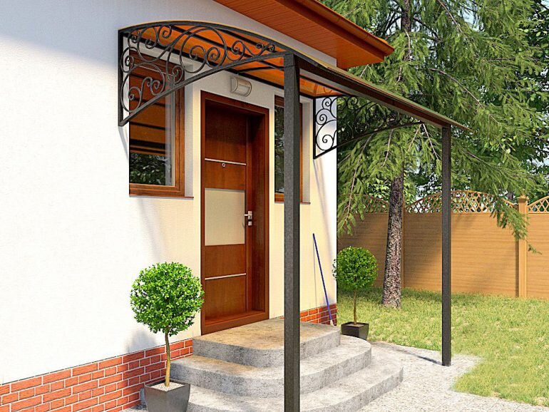 Навес над входом – это не только эстетика, но и безопасность ваших дверей, укрытие от непогоды и осадков. Главная задача этих конструкций – защита входа в здание и имущества от пыли, ветра, дождя и других воздействий, включая перегрев и выгорание входной конструкции. Каждый хозяин дома сам решает какую именно конструкцию он хочет видеть за дверью, однако, мы советуем подбирать козырек так, чтобы он мог закрыть не только пространство у двери, но и ступеньки. Прозрачный стеклянный козырек будет пропускать больше солнечного света. Козырьки над крыльцом обычно крепятся непосредственно к стене. Это достаточно лёгкие, но крепкие конструкции, способные выдержать не только удары стихии, но и неожиданные удары веток рядом стоящих деревьев. Защитные козырьки над входом в дом, которые мы изготавливаем: ✔️ прочный и жесткие - внешнюю нагрузку берет на себя надежный металлический каркас, ✔️ сочетаются с различными материалами - металлические конструкции подходят к профилированному брусу, бревну, б