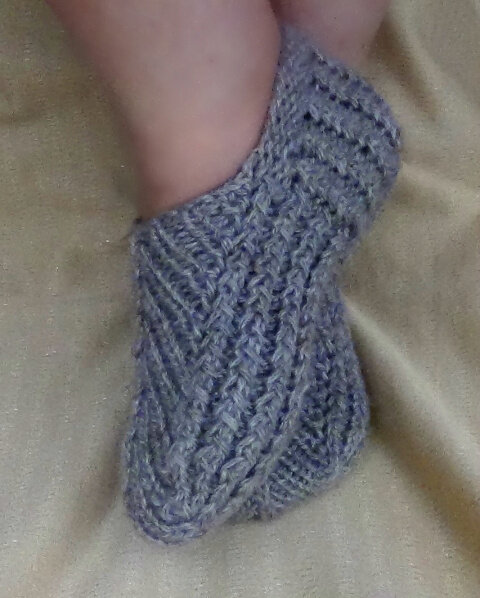 Размер 38-39. Спицы №3, пряжа 150 м. на 100 гр. Набрать на спицы 24 петли и вязать платочным узором 6 рядов. Затем прибавить сразу 7 петель. На спицах должно получиться 31 петля. Далее вяжем узор - 1 ряд = 1 кром., *из 2 лиц петель вяжем 2 лицевые(две вместе, не снимая вяжем вторую лицевую петлю из первой), 1 изн.* , повторяем до конца ряда . 2 ряд = на изнаночном ряду все петли по узору. Повторяем чередую первый и второй ряд на высоту пятки. Вывязываем пятку - делим все петли на 3. 1 лишнюю оставляем на внутренней части пятки. 10 петель лицевых. Далее плетенка ( из двух петель две - повторить 4 раза, 1 лиц.) 21 петлю и 22 вяжем вместе одной лицевой петлей. Поворачиваем вязание в обратную сторону и вяжем - кромочная, 9 изн., 10 и 11 вяжем вместе одной изнаночной петлей. Поворачиваем обратно - кромочная, 1 лиц., из 2х 2 - повторить 4 раза. две вместе и т.д. пока на спицах не останется 11 петель. Добираем петли по боковым сторонам пятки и вяжем далее как показано на видео на длину