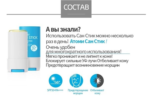 Для тех, кто хочет погреть свои косточки Atomy sun stick - мощная защита от ультрафиолета в форме стика! Полностью соответствует потребностям светлой, чувствительной кожи. Использовать средство просто и удобно: в одно мгновение выкручивается и закрывается колпачком. Легко наносится на кожу, руки не пачкает, следов на одежде не оставляет. Наносить можно как до макияжа, так и поверх. Он водостойкий, имеет лимонный аромат. Состоит исключительно из натуральных ингредиентов. Подходит для всей семьи.