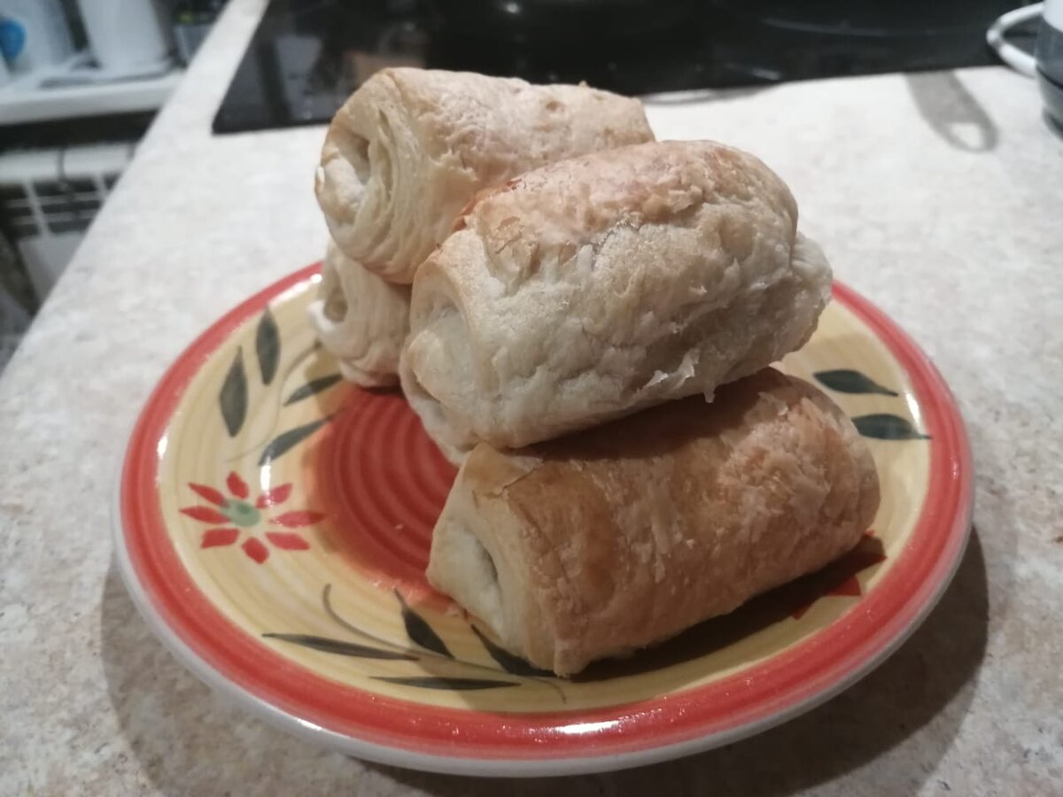 Рецепт: Тесто дрожжевое слоеное- 500 г Бананы- 3 шт Раскатываем тесто, режем на квадраты. Режем банан на 4 части и каждую часть поперек режем напополам. Кладем на край теста банан, закручиваем и край защипываем. Выпекаем при 180 градусах до золотистой корочки. Когда остынет посыпать сахарной пудрой. Всё!))) Приятного аппетита)
