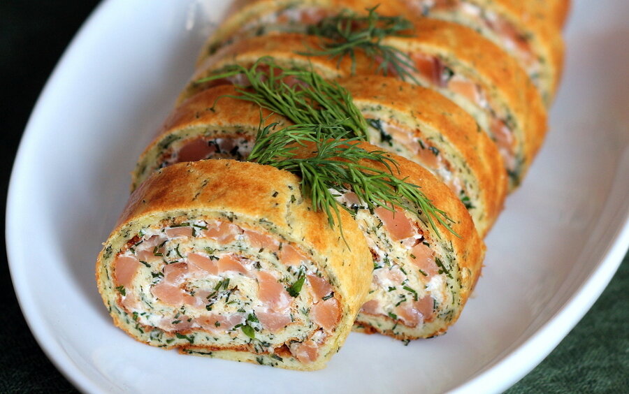 Этот рулет является частым гостем на моем праздничном столе. Однако ничто не мешает приготовить его и в обычный день. Достаточно лишь вашего желания побаловать себя чем-нибудь легким и очень вкусным! Конечно, для приготовления данного блюда приходится потратить время и силы, но поверьте – результат того стоит! Для приготовления нам понадобится: филе красной рыбы соленой семга, форель- 200 грамм масло сладкосливочное – 25 грамм молоко – 1 стакан мука – 50 грамм яйца – 3 штуки сыр пармезан (пойдет любой твердых сортов) – 100 грамм зелень – 100 грамм (укроп, петрушка, кинза – любая, что вам нравится) сметана – 150 грамм соль, перец по вкусу Переходим к приготовлению: Берем кастрюлю, забрасываем в нее масло, начинаем нагревать на плите. Когда масло растает – засыпаем муку, тщательно мешая. Вливаем молоко. Главное – не выключать огонь и не переставать мешать! Наша цель – добиться однородной тестообразной массы без комков. Для перемешивания отлично подходит венчик. Держим на огне, пока наше