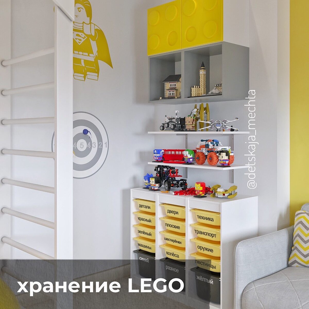 👉 Основное - это сортировка деталей. Проще найти нужную деталь + грамотное хранение + стимул собрать что-то новое. Lego лучше сортировать: 🔸по цветам 🔸по форме и типу деталей (двоечки, пластины, со скошенными углами, нестандартные и т.д.) 🔸фигурки и мелочевка 🔸по Наборам и лучше в покупных коробках или zip-пакетах. Выбирайте удобную именно для вас сортировку Lego, мы с моим сыном Пашей (ему 8 лет) сейчас сортируем по наборам 😉. 🔘 Для малышей Lego Дупло: 1. Сортируем по темам в пластиковые неглубокие коробки, например, ИКЕА. 🔸 Коробка для строительства дома, магазина, фермы, замка (окна, двери и основные крупные детали Lego). 🔸Ящик с железной дорогой. 🔸Отдельно фигурки людей, животных, тележки, мебель для дома, вся мелочевка. 🔸Ящик с машинками и их деталями. 2.Пластиковый комод с выдвижными ящиками. 3. Если ваш ребенок еще мал, чтобы заниматься сортировкой - купите коврик-мешок. Поиграл на коврике, затянул веревку и убрал все сразу. 📦 Как хранить Lego: 1⃣. Стеллажи с выдвиж