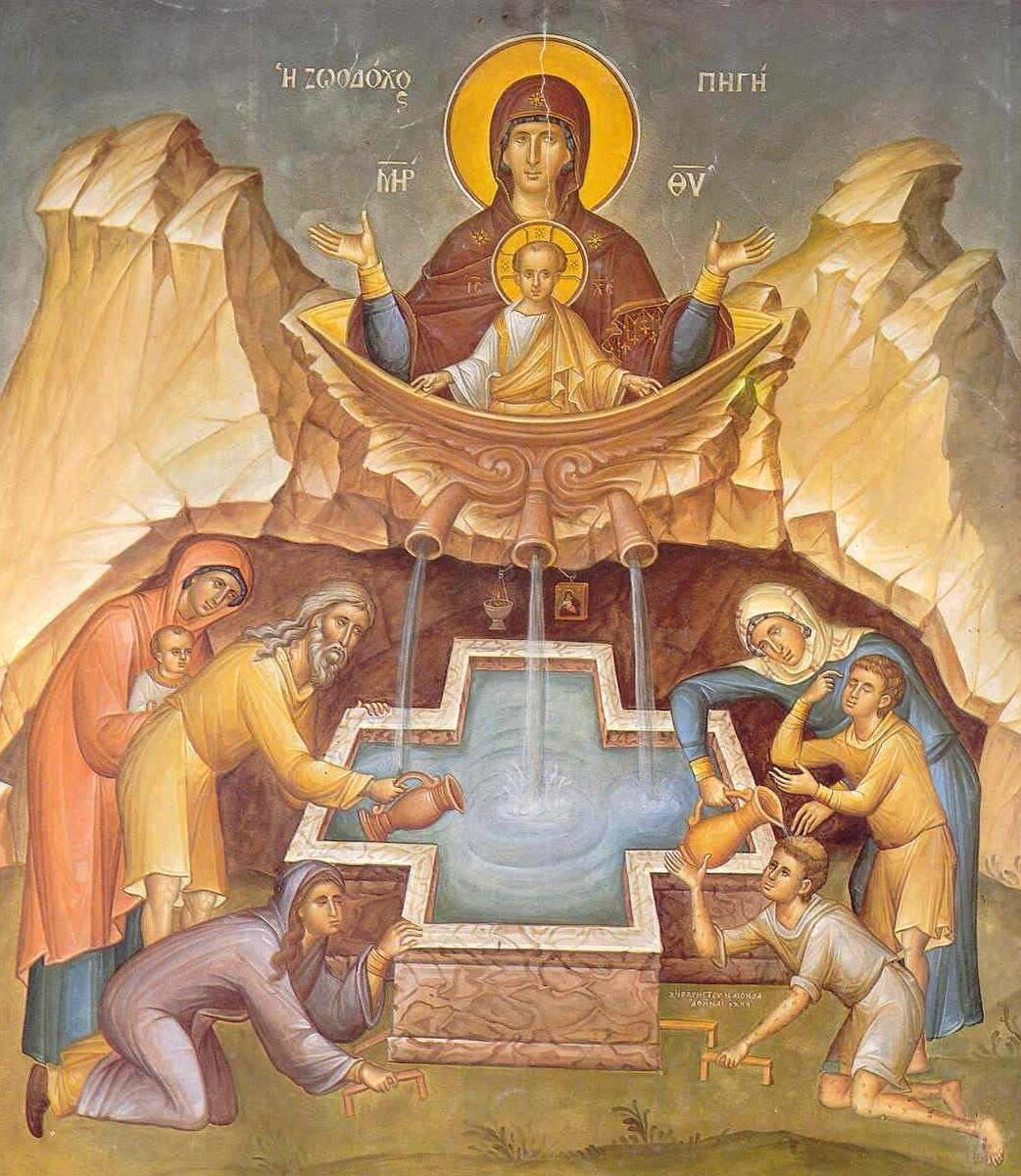 В пятницу Светлой седмицы Церковь чтит память чудотворной иконы Пресвятой Богородицы "Живоносный источник". Она имеет интересную историю. Заброшенный источник В пятом веке будущий император Лев проезжал мимо Золотых ворот в Константинополе. Там был парк, в котором находился источник в честь Пресвятой Богородицы. Со временем он пересох, был заброшен. Лев увидел слепого, который просил помощи. Будущий император пошёл искать воды. И вдруг услышал голос:" не там ищешь. Иди в рощу, там найдёшь живоносный источник. Дай этой воды слепому, а потом построишь здесь храм во имя Моё". Лев понял, что говорила ему Сама Пресвятая Богородица. Он выполнил Её приказ. Нашел этот источник, зачерпнул воды и дал слепому. Он выпил её и прозрел. Став императором, Лев выполнил приказ Пресвятой Богородицы, построил в честь Неё храм на этом месте. В 15 веке мусульмане разрушили храм, не разрешали христианам подходить к источнику. Но потом все же христиане смогли набирать воды из целебного источника. В 1835