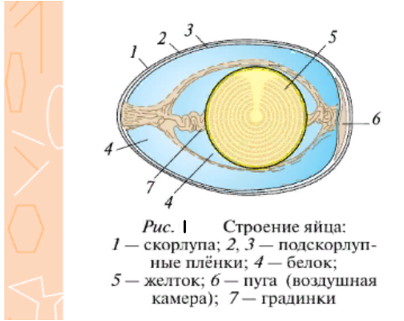 Яйца являются популярным и дешевым по цене продуктом питания. Чем вызвана такая высокая популярность приготовления блюд из яиц к завтраку? Яйца – это ценный пищевой продукт, богатый белками, витаминами и минеральными веществами. В кулинарии используют яйца кур, перепёлок, индюшек, уток и гусей. Для выпечки кондитерских изделий используют исключительно яйца кур, так как все остальные имеют сильный своеобразный запах. Вес куриного яйца колеблется от 43 до 65 г. Яйцо состоит из воды (73%), белка (13%), жира (12%), углеводов (1%), минеральных солей (1%). Строение яйца показано на рисунке 1. Самой питательной частью яйца является желток. В нём сосредоточены витамины A, D, E, K, PP и витамины группы В. Из яиц можно быстро приготовить множество блюд всего за несколько минут. Яйца добавляют в другие блюда: тесто, приправы, соусы, начинки – что не только улучшает вкус готовых изделий, но и увеличивает их пищевую ценность. Яйца нельзя долго хранить. В зависимости от срока хранения яйца подраздел