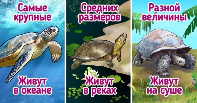Существует множество разновидностей черепах, но все они делятся на 3 большие группы: морские, пресноводные и сухопутные.