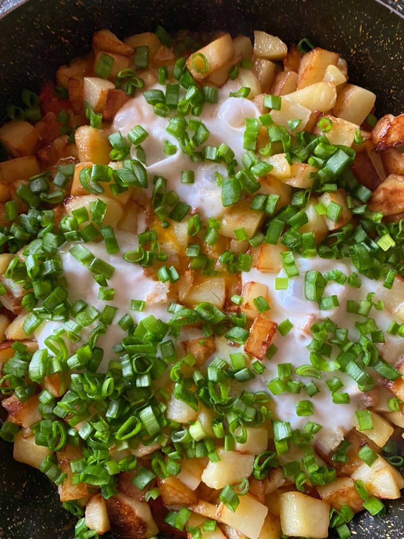 Очередной раз доказываю,что в мире полно вкусной еды без мяса) Ингредиенты: Картошка, Лук большой, Перец болгарский, Помидор, Яйцо, Зелень любая , Соль, перец Способ приготовления: Картофель чистим, нарезаем кубиком и обжариваем порционно до полной готовности и румяной корочки. Откладываем картофель в отдельную тару и оставляем. Лук режем полукольцами и обжариваем пару минут, затем добавляем нарезанный кубиком перец. Жарим до мягкости. Следующим этапом добавляем помидор, также нарезанный кубиком, солим, перчим по вкусу. Оставляем томиться под закрытой крышкой, минут на 5. Далее выкладываем к овощам обжаренный ранее картофель, разравниваем лопаткой, вбиваем 3 яйца, закрываем крышкой и оставляем на небольшом огне. В заключении посыпаем блюдо зеленью, у меня это лук и можно наслаждаться).