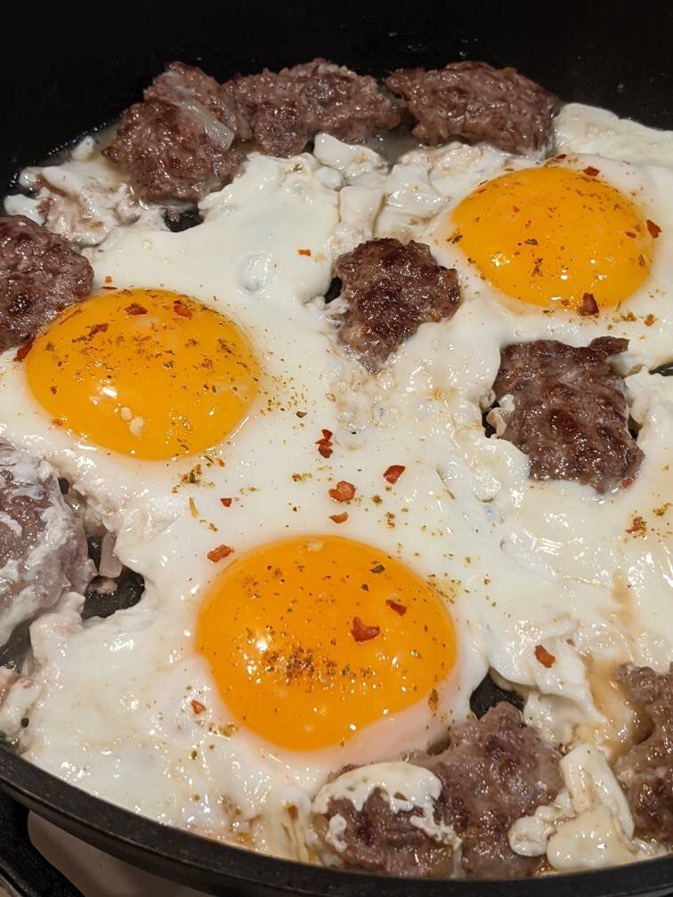С детства люблю такую яичницу, раньше часто оставался фарш и так вкусно было на утро сделать такую яичницу 😋 #завтрак #фарш #яйца #яичница #глазунья #академия Ингредиенты: Фарша говяжьего, Яйца, Соль, перец, приправы, Оливковое масло Способ приготовления: На сковороду с оливковым маслом выкладываем маленькие котлетки из фарша, чем тоньше и меньше они будут тем быстрее приготовятся и будут вкуснее. Котлеты переворачиваем на другую сторону, даём немного схватиться и разбиваем рядом яйца. Добавляем соль, перец и любимые приправы. Если какие-то котлетки мало поджарились, можно перевернуть. По готовности перекладываем на тарелку и едим макая хлеб.