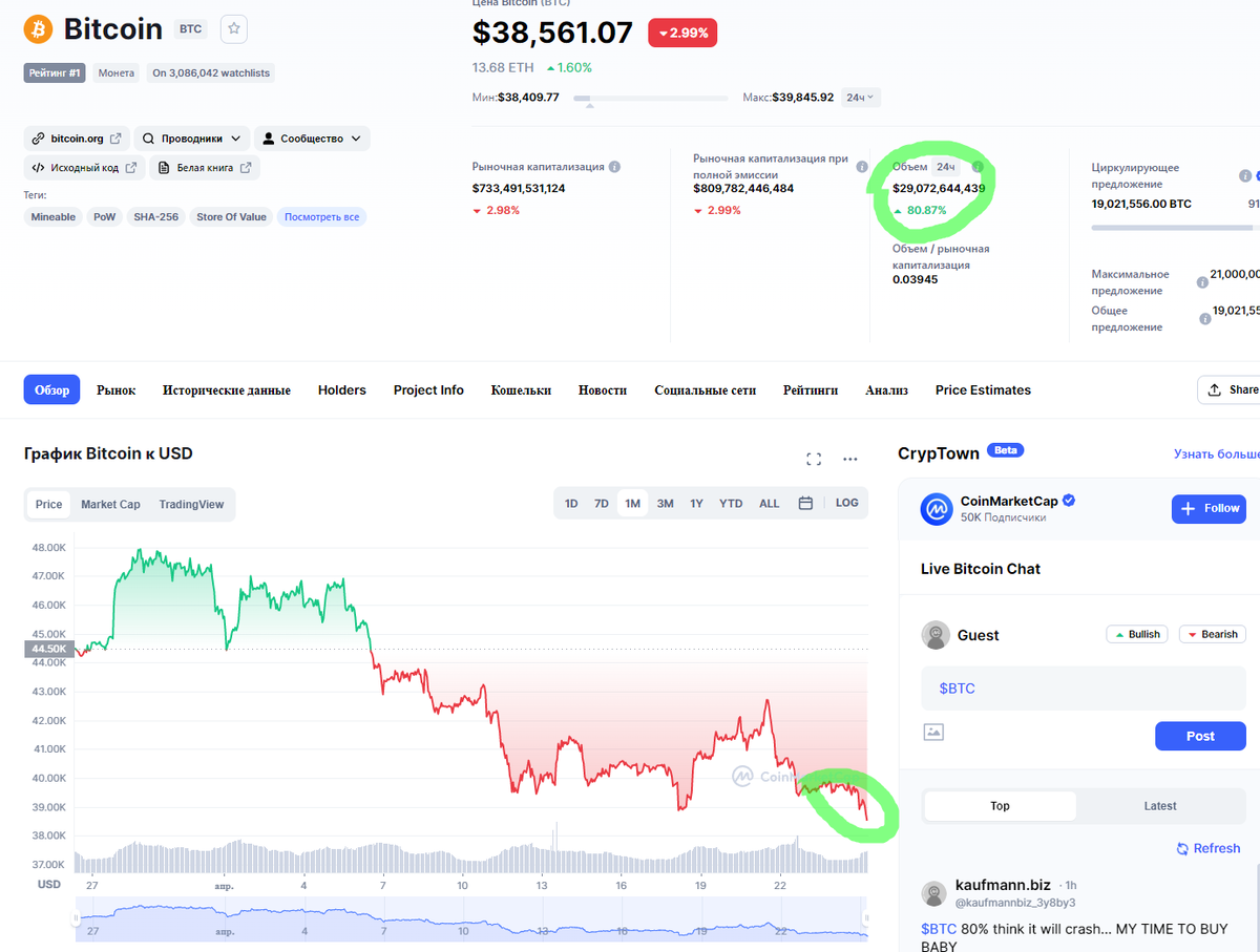 Обратите внимание на график ниже. На утро 25 апреля курс цифрового золота продолжает снижаться, опустившись до самой низкой отметки за последний месяц. При этом есть не менее интересные данные