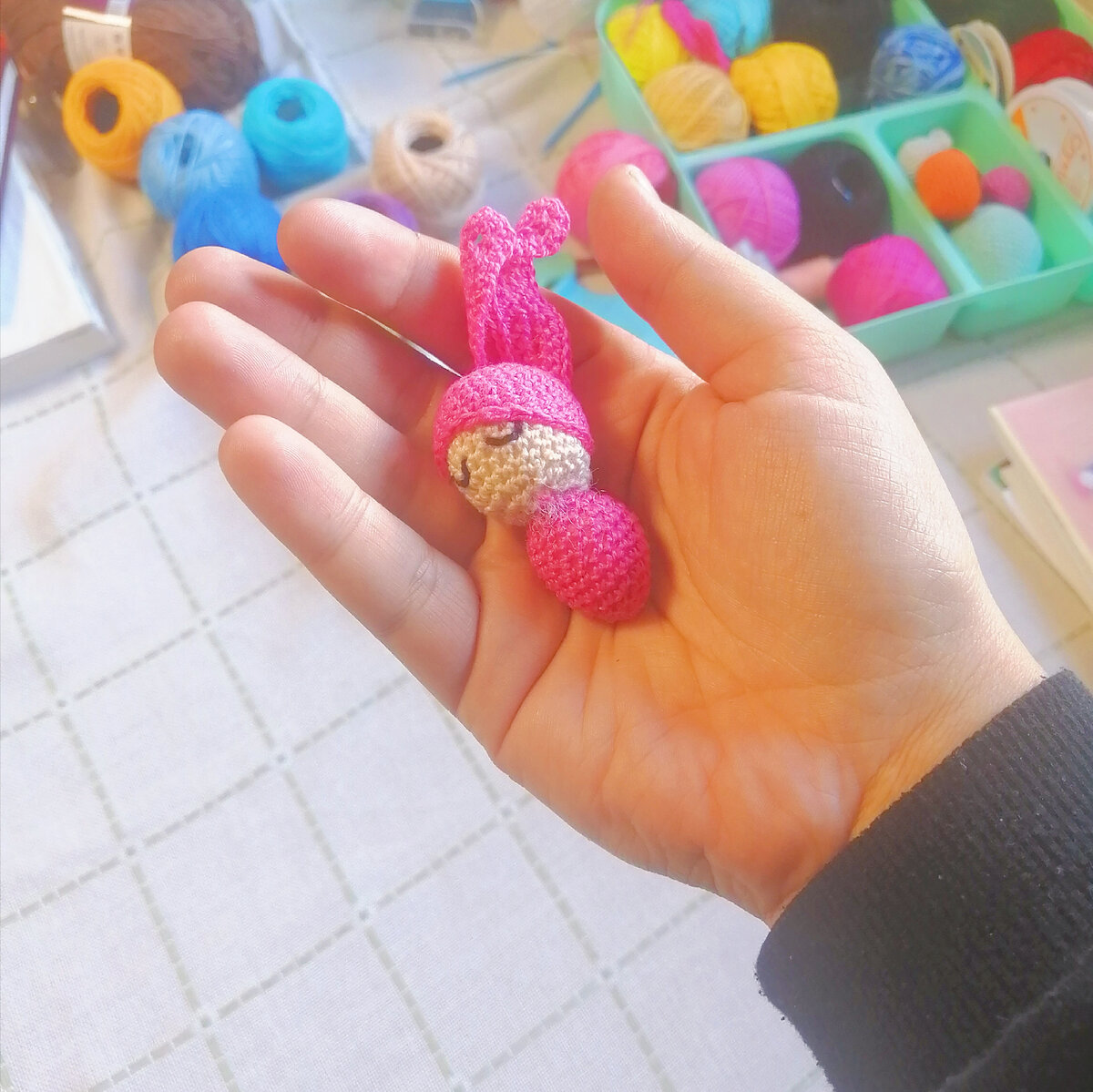 Всем привет ✨ Сегодня я связала вот такую милую ляльку зайку. Вязала крючком 1.5 мм и нитками "ирис" Схема ляльки зайки 🐰 Голова: 1)6сбн в ка 2)6пр (12) 3)(сбн,пр) х 6 (18) 4) (2 сбн, пр) х6 (24) 5-10) 24 сбн 11) ( 2сбн, уб) х6 (18) 12)(сбн, уб) х6 (12) 13)6 уб Шапочка: 1)6 сбн в ка 2)6 пр (12) 3)(сбн, пр) х 6 (18) 4)(2 сбн, пр) х 6 (24) 5-10)24 сбн 11)(6 сбн, уб) х 3 (21) Тело: 1)6 сбн в ка 2)6 пр (12) 3)(сбн, пр) х 6 (18) 4-8)18 сбн 9)(сбн, уб) х 6 (12) 10)12 сбн Уши ( 2 детали, нить в 2 сложения) : 1)16 вп 2)во 2 петлю от крючка: 14 сбн, 3 сбн в 1 петлю, 14 сбн 3)вп, 12 сбн, пр, сбн, 3пр, сбн, пр, 12 сбн Пишите в комментариях, свяжет или уже связали такую милашку❤️ будет интересно почитать