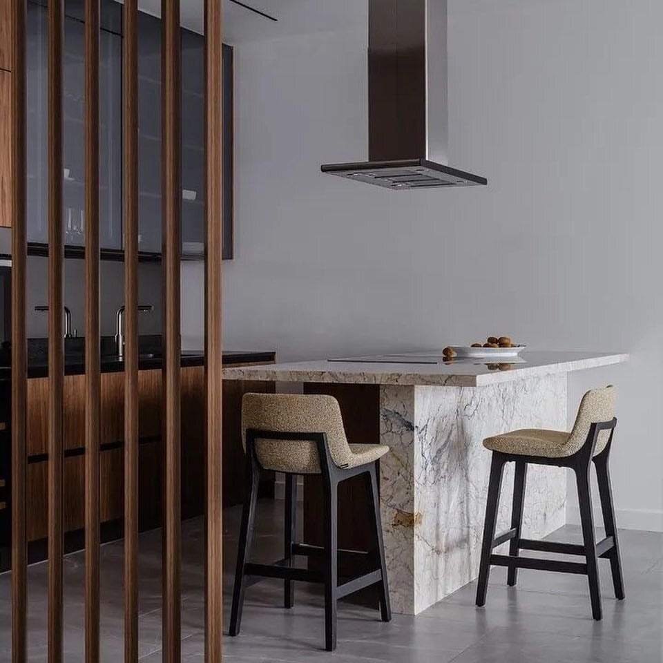 Дизайнер проекта Екатерина Бекух использовала натуральные фактуры материалов в создании этого интерьера. Фасады кухни выполнены из шпона Орех Тоскана, а шкафы-витрины со стеклом с зеркальным эффектом оснастили внутренней вертикальной подсветкой с регулировкой яркости свечения. Композиционным центром пространства стал остров, обрамление которого выполнили из натурального камня. Его хаотичный рисунок, созданный самой природой, перекликается с оттенками всех элементов современного интерьера. Проект реализован салоном Giulia Novars г.Краснодар Дизайнер-конструктор салона - Юлия Ляликова #ДИЗАЙН #ИНТЕРЬЕР #КУХНЯ #мебельназаказ #ИЖЕВСК #дизайнпроект #СТИЛЬ #кухняназаказ