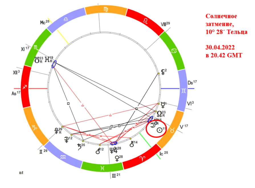 Первое: 30.04.2022 Солнечное затмение в 10° 28´ Тельца коснется всех, у кого есть планеты в 9° 28´- 11° 28´ знаков фиксированного креста (Телец, Лев, Скорпион, Водолей). ВСЕХ остальных затмение коснется косвенно, затронет через события у друзей, близких, родных. Возможно, что Вам придется просто наблюдать за реализацией затмения у других людей, без вашего личного включения в их «драму».