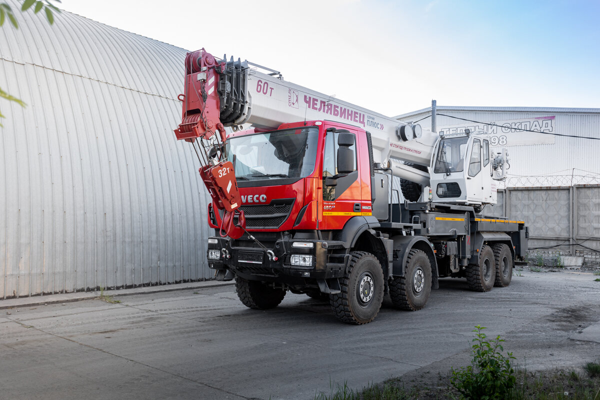 Сегодня на повестке дня Автокран ЧЕЛЯБИНЕЦ грузоподъёмностью 60 тонн! Установнка базируется на полноприводном шасси IVECO-AMT. Колесная формула 8х8. Двигатель Cursor-13 мощностью 500 л.с. Коробка передач -механика ZF, 16 ступенчатая. Несмотря на габариты и массу, автомобиль крайне прост в управлении. Радиус разворота в разумных пределах, благодаря хорошему вывороту передних двух осей. Коробка переключается легко. Разве что парковаться задом непросто из-за противовеса :)