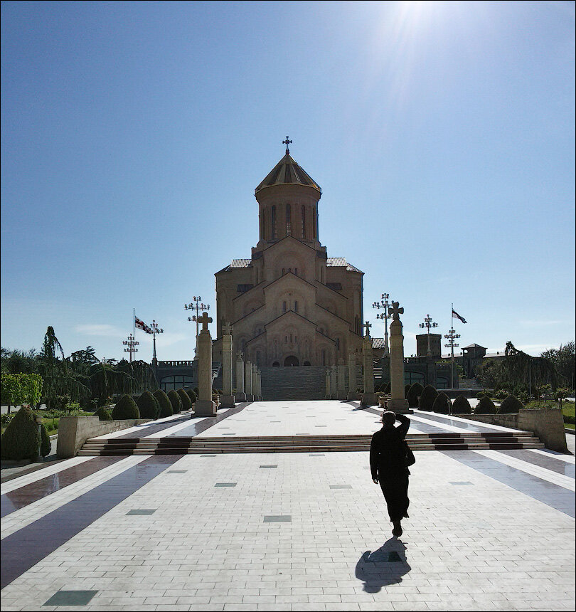 Собор впечатлял. Разглядывая его издали, с другого берега Куры, оценить его масштабность довольно сложно. Хоть мы и знали, что Цминда Самеба — один из самых больших православных храмов в мире. Но только приблизившись к его воротам, мы осознали, насколько велик собор.