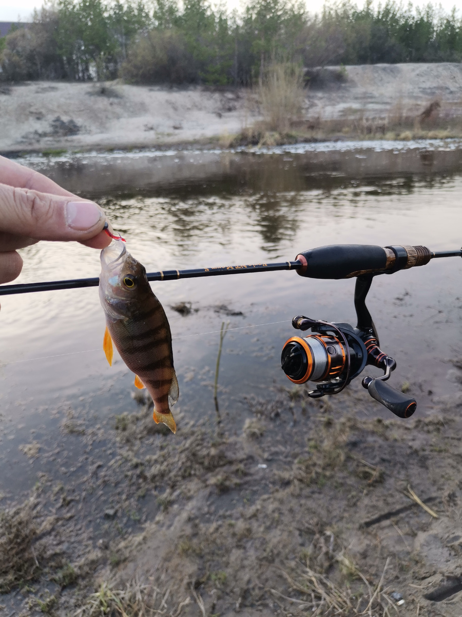 И вот 19:00 провались оно всё... Беру Fario NT Morm S, уже не вешаю камеру и на легке на речку, солнце клонется к горизонту и стихает ветер, второй заброс и окунь:
