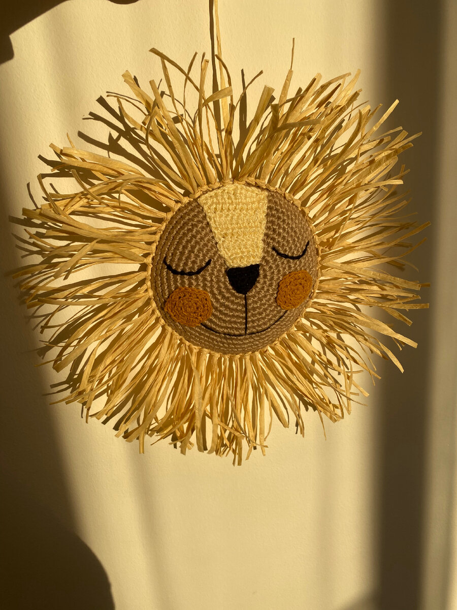 Мы начали ремонт в детской комнате. Надо отметить, что это очень сложно. Сложнее чем кухня и остальные комнаты. Я только с расстановкой мебели провозилась около недели. И пока есть немного времени решила сделать декор. Сегодня расскажу как делала панно «Львёнок» Вам понадобится: 50гр хлопковой или акриловой пряжи песочного, сливочного или любого другого тёплого оттенка для мордочки. Могут подойти и остатки полушерсти (только обработать надо бы от моли) Остатки тонкой чёрной пряжи и розовой или цвет на ваш выбор - для щёчек и на носик (контрастного цвета от основы) Изюминка - это грива. У меня ушло пол-мотка рафии (40гр в мотке). Можно использовать любую другую пряжу, которая держит форму или взять мочало. Из инструментов: крючок, ножницы и игра с большим ушком. Ход работы Необходимо связать круг крючком. Для этого сначала нужно сформировать кольцо амигуруми Затем вязать по правилу круга на нужный вам диаметр. У меня 17 см. Для того чтобы круг был ровный, я делаю прибавки в разных