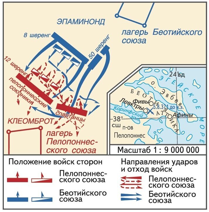 Победа Эпаминонда при Левктрах произвела ошеломляющее впечатление на всю Грецию. Никогда до сих пор спартанцы не проигрывали сражения уступавшему им по численности противнику Но Фивы одержали не просто победу Эпаминонд первым открыл великий тактический принцип, который вплоть до наших дней определяет исход почти всех решающих сражений: неравномерное распределение войск по фронту в целях сосредоточения сил для главного удара на решающем участке.