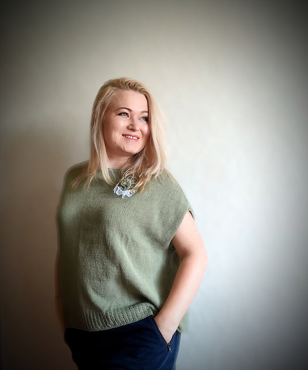 Связано из Троицкой пряжи Фиалка. Цвет "Омут" Спицы 2.5 кубические Расход 230 грамм Размер 46-48 росс. Полотно из этой пряжи мнётся. Тактильно напоминает лен. Правда чуть менее жёсткий. Не знаю как вам, а мне нравится цвет и фасон. Буду носить с удовольствием. Кстати, брошь ручной работы. Изучаю новый вид рукоделия.