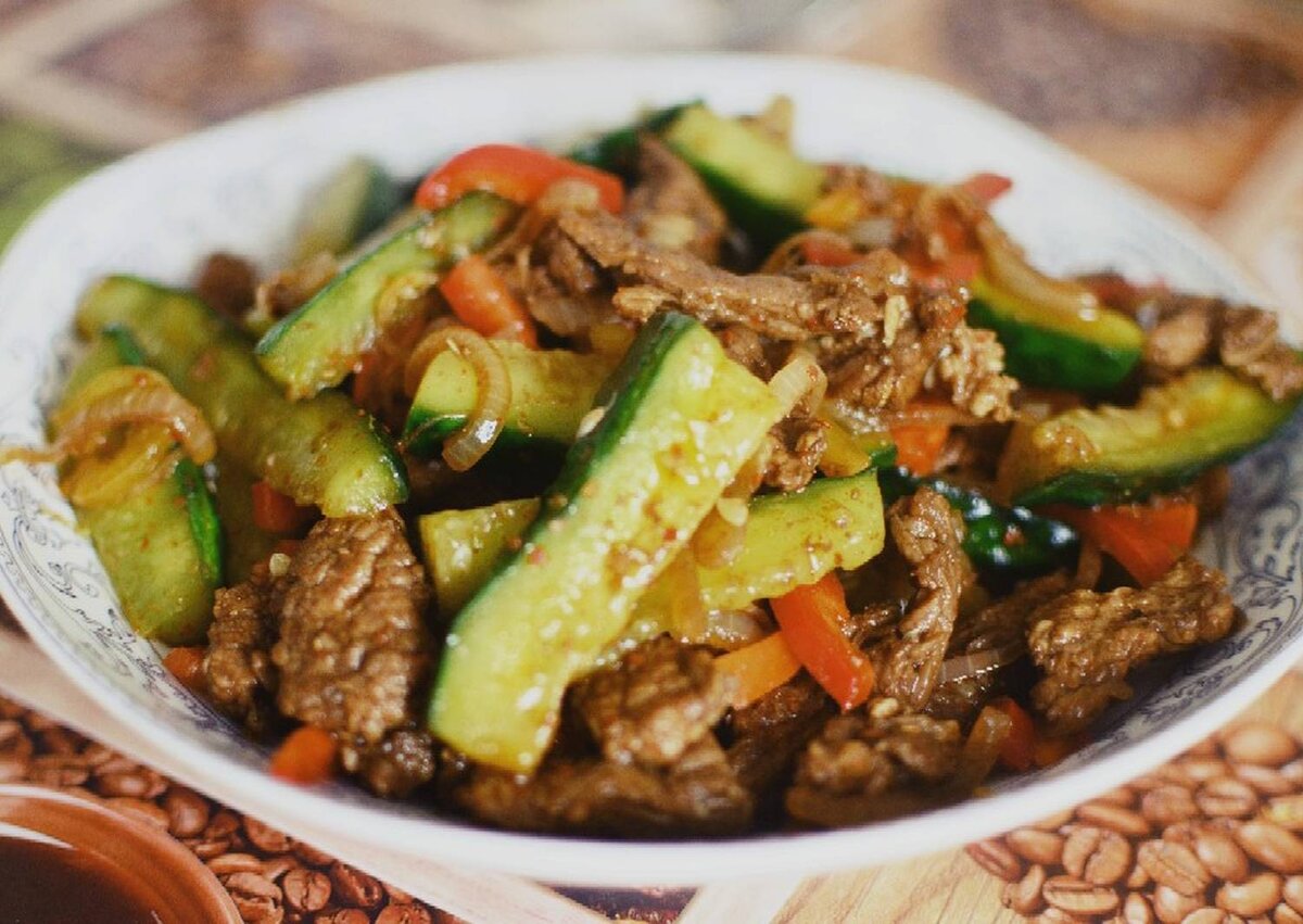 Ингредиенты Способ Приготовление Овощи вымить и очистить. Огурцы нарезать брусочками, морковь нарезать тонкой соломки. Хорошо посолить огурцы с морковью и смешать. Оставить на 20 минут, чтобы соль растворился и выделили сок. Сладкий перец нарезать тонкой соломки свежую кинзу порубить. Как можно тоньше нарезать говядину. Лук нарезать перьями. С огурцов слить всю жидкость. Добавить сахар, красный перец, молотый Кориандр. Перемешать хорошенько и оставить. Обжарить говядину в течение 5-6 минут на растительном масле затем добавить лук и Соевый соус, жарить ещё 2-3 минут К огурцам выложить мясо с луком и маслом, добавить чеснок пропущенный через пресс Перемешать. Положить Сладкий перец и кинзу влить уксус и присыпать кунжутом. Дать салату настояться 30 минут. Приятного аппетита