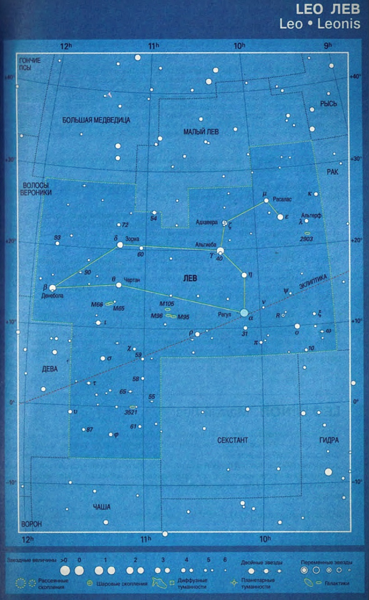 Одно из немногих созвездий, чей рисунок напоминает фигуру, отображённую в названии — в данном случае это припавший к земле лев. Голова Льва обрисована так называемым Серпом из шести звезд от ε (эпсилон) до α (альфа) Льва; от нее вытянулось туловище Льва, а его хвост отмечен звездой β (бета) Льва. В мифологии Лев, по общему мнению, был убит Геркулесом, это был пер вый из 12 подвигов древнегреческого героя. Солнце пересекает созвездие с середины августа по середину сентября. Каждый год в ноябре наблюдается метеорный поток Леониды с радиантом в точке вблизи γ (гамма) Льва.