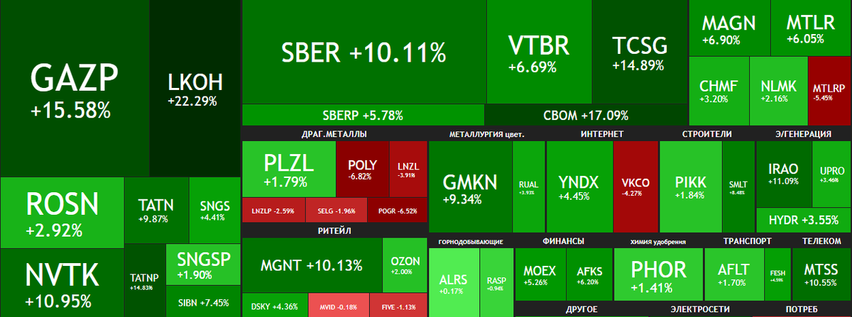 Российские акции резко стали набирать в стоимости, если смотреть персонально по эмитентам, то в некоторых случаев рост составил - почти 23 %. В этой статье посмотрим на динамику стоимости российского рынка и попробуем разобраться, когда все таки покупать или продавать акции. А также попробуем понять причины роста. Итак, начнём... Карта рынка Никто не ожидал роста стоимости, да и если смотреть на факторы роста - то прям существенных факторов и положительного фона - не имелось.Но как можно наблюдать, более 90 % акций российских компаний показали рост. Лидеры роста за неделю Давайте посмотрим на лидеров роста: За текущую неделю на волатильности акций Лукойла мой знакомый заработал дважды. Покупая акции на снижении и продавая на росте, он сделал почти 10 % выручки от суммы портфеля. Кроме того, исходя из инвестиционных разговоров, многие ожидают от Лукойла дивиденды. По неофициальной информации, сумма дивидендов может составить более 20 %, но это пока только разговоры. В данном случае я