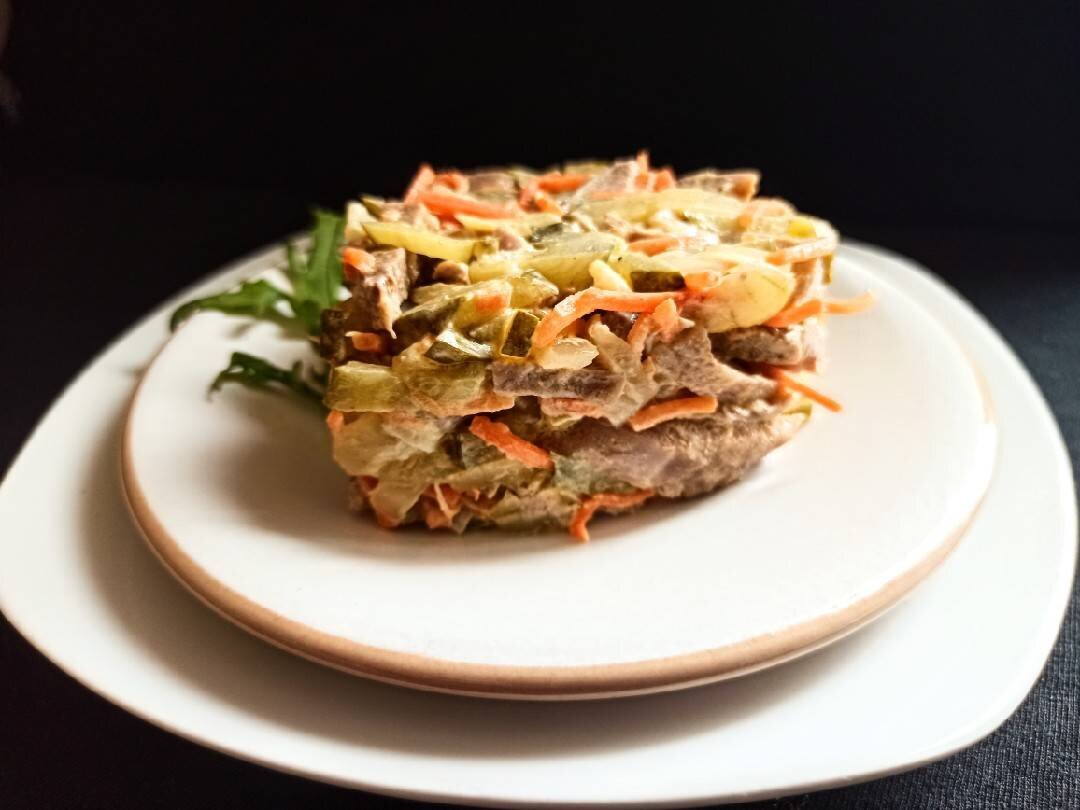 Очень понравился салат по рецепту автора Натальи Морозовой @morozovanata . Большое спасибо ❤️ #академия Ингредиенты: отваренного заранее свиного языка, репчатого лука, маринованных огурца (можно солёных), моркови по-корейски (у меня не острая), майонеза (примерно), растительного масла, Соль, молотый черный перец по желанию (я не добавляла) Способ приготовления: Лук почистить, порезать полукольцами, обжарить на растительном масле до мягкости. Язык и огурцы порезать тонкими брусочками. Морковку порезать на части. Всё сложить в миску и перемешать. Добавить майонез, перемешать. При необходимости добавить соль и при желании перец. Я не добавляла, мне вкус показался достаточно сбалансированным. Дать немного настояться. Приятного аппетита и будьте здоровы 🌺